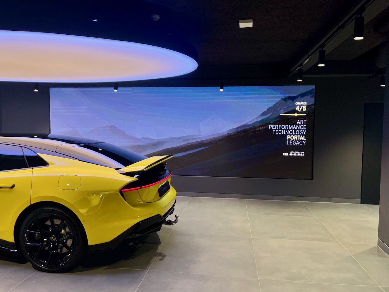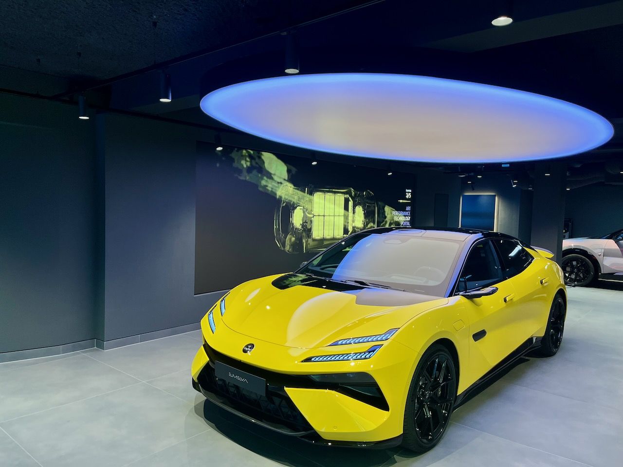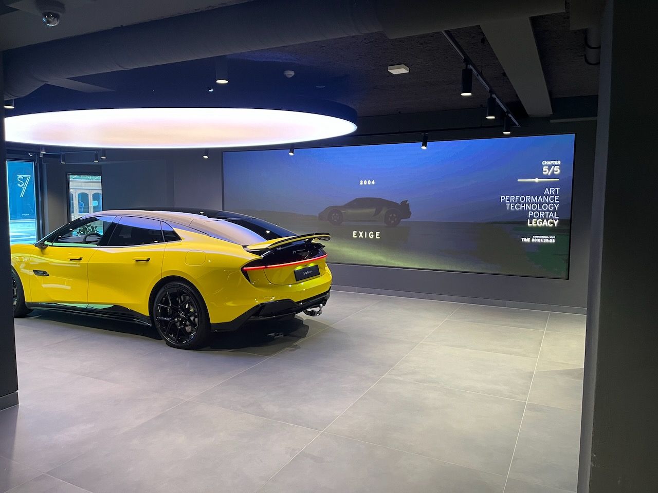 • Definition Wall: Three portrait screens driven by the Car Configurator provide detailed insights into the materials and craftsmanship of Lotus vehicles.
